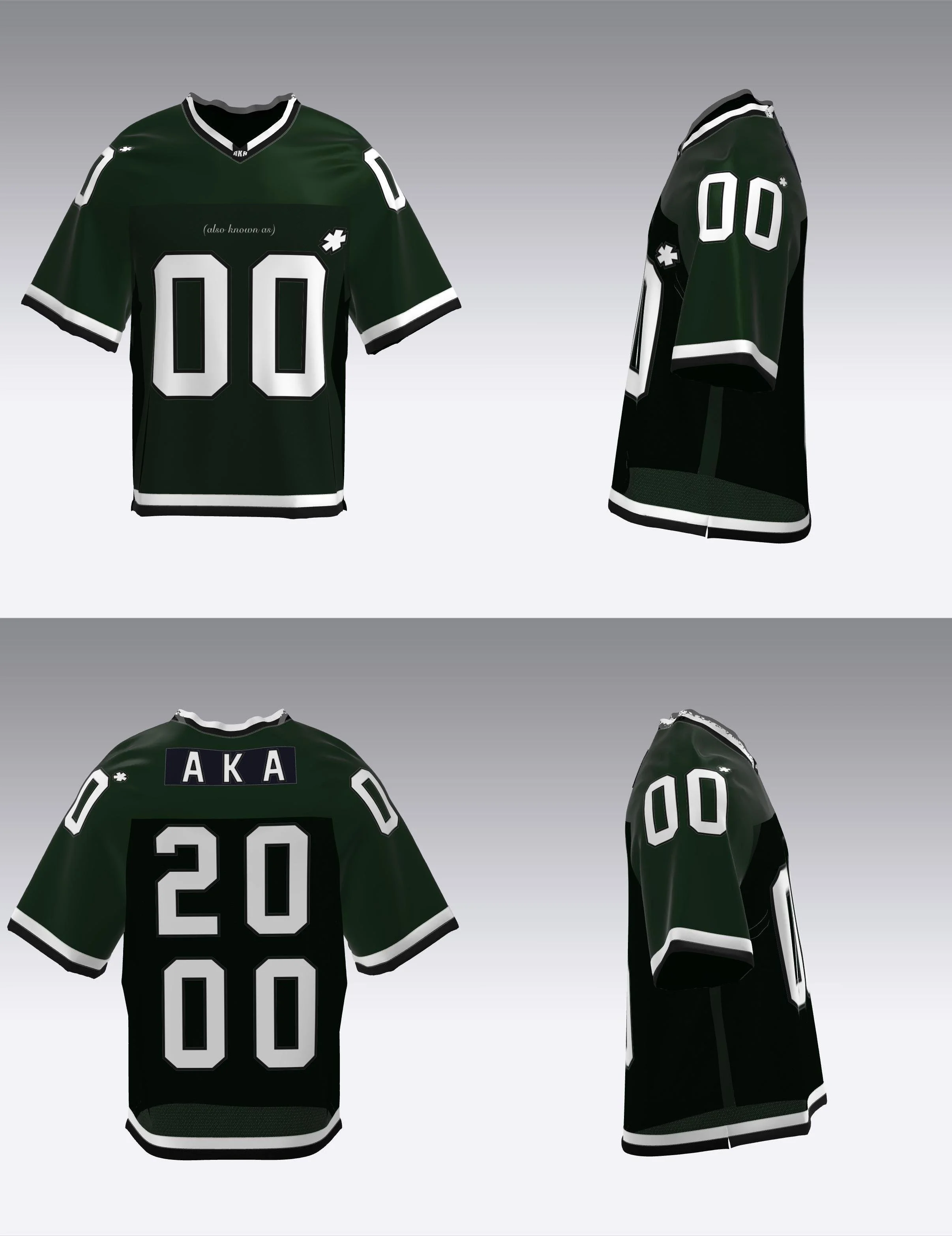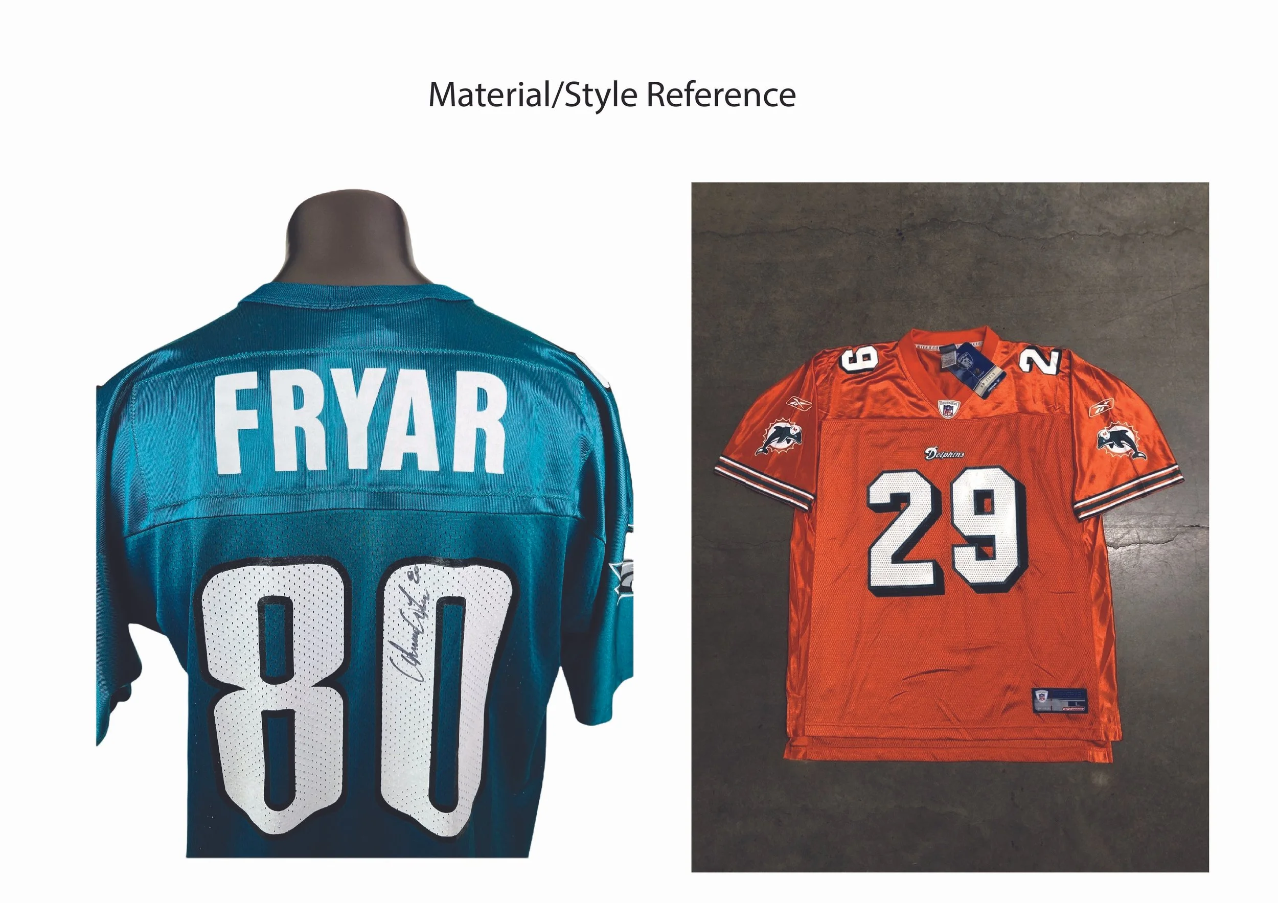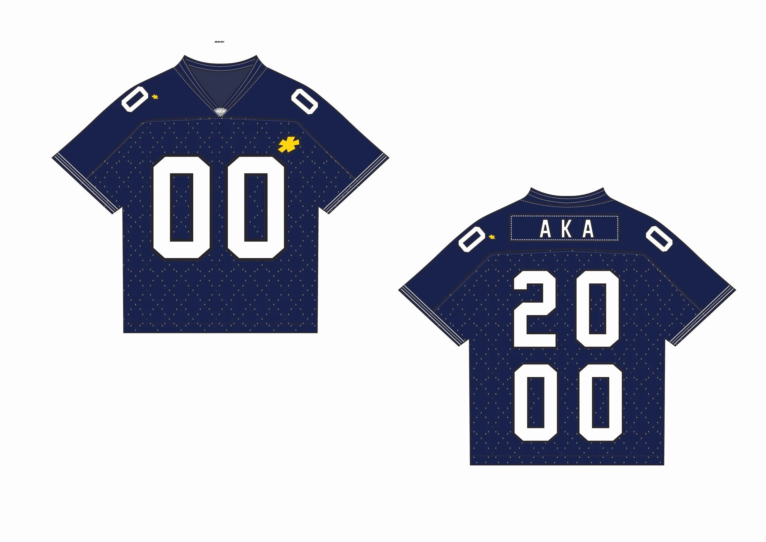 (Mar. 2026) Mesh football Jersey inspired by early 2000s football jerseys. Details include a satin yoke and a mesh bodice. Rib knit is used for the collar while the arm sleeves and hem both use plain strips of a combination polyester/spandex fabric. All graphics on the jersey are screen printed as well and contrast topstitching is on all seams. Fit of the garment is intended to be regular with the sleeves stopping right above the elbow.