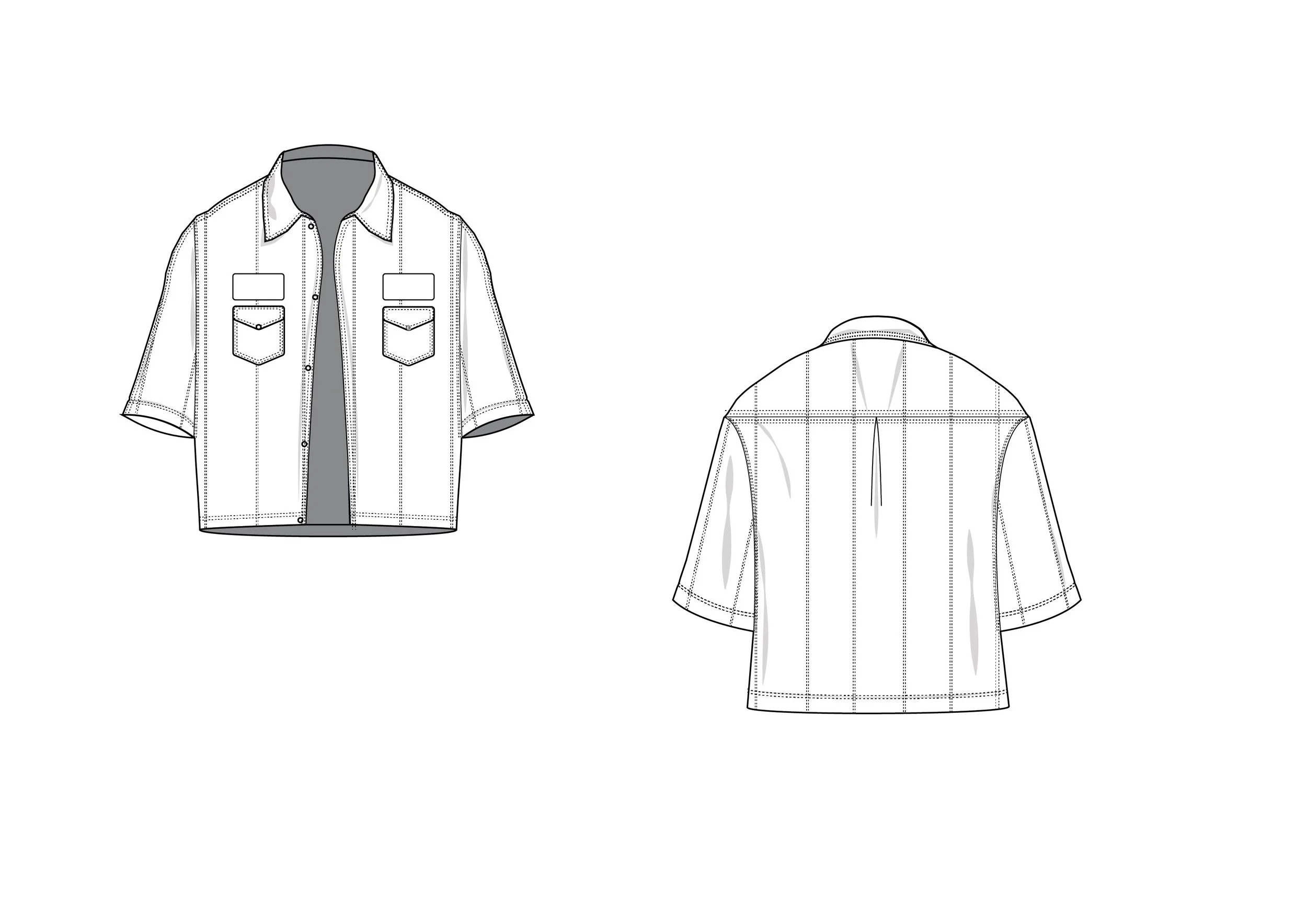 (Jan. 2026) This is a work shirt I designed for a collection that I am currently working on for my own brand. The design of the shirt is based on a mechanic shirt while having some more modern design choices such as a slight crop fit as well as the shoulders being slightly dropped as well. Aside from those choices, most of the other design elements such as the patches and the back logo hit were all inspired by actual mechanic shirt designs that I found as references to my design. I also included pinstripe topstitching on one variation so that it created more cohesion between the carpenter shorts that I was working on that are also a part of the collection. The other variation of the shirt has topstitching only around the seams to so that they are a more subtle detail while still emphasizing the construction of the garment itself.