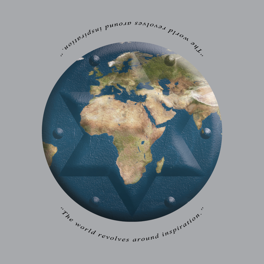 The design of the shirt is based around the concept that inspiration transcends distance and can help to give birth to an idea in a different part of the world. The design is fairly forward with the globe being modeled after globes seen in classrooms. The visual texture effect on the globe is meant to bring a person back to them dragging their finger across a globe as a child. The part of the world that is being displayed is very intentional as well, as Africa is the considered the birthplace of humanity and therefore could be a seen as the birthplace of idea. India is also displayed as the sub-continent has given things such as philosophy and culture to the world, eventually inspiring people to take up popular practices such as yoga. Europe is pictured because of the role it played in ancient times, serving as a hub for western thought and philosophy in general, and eventually inspiring and leading to things we still use today such as certain forms of government. Finally, South America is barely pictured to the bottom left to represent the ambition that comes from inspiration and how it can lead us to places we never expected, as this was somewhere that people didn’t know of initially, but once stumbled upon quickly began to make voyages to continue learning about the continent.